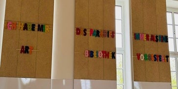In Technik und Design wurde auch der Bibliothek ein toller Spruch verpasst. Buchstaben wurden hierbei aus Karton mit Stanleymessern ausgeschnitten und anschließend mit Wolle umwickelt. Die ersten Klassen haben hierbei ihre Fingerfertigkeit unter Beweis stellen können.
